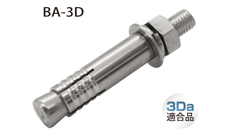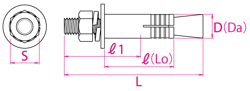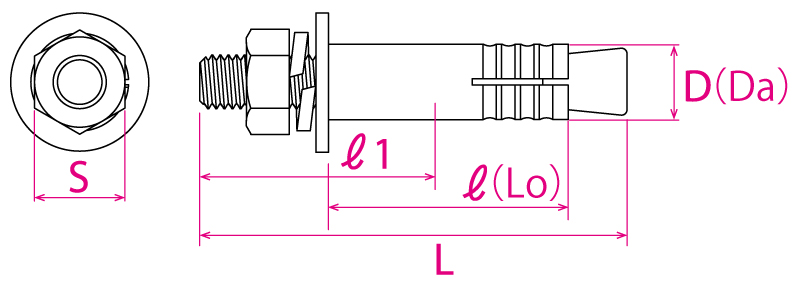 | ねじの呼び | 品番 | アンカー外径 D(Da) | 全長 L | ねじ長さ ℓ1 | スリーブ長さ ℓ(Lo) | 最大 取付物厚 | 穿孔径 | アンカー 埋込み長さ | 穿孔深さ | ナット二面幅 S | 入数 | 標準価格 (税抜き) | |