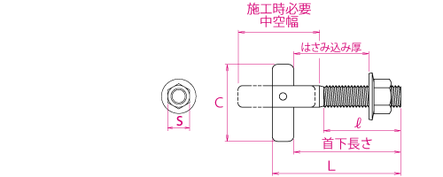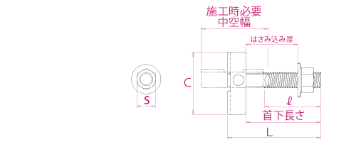 ねじの呼び | 品番 | 全長 L | 首下長さ | ねじ長さ ℓ | はさみ込み厚 | プレート長さ C | 座金付きナット 二面幅S | 施工時必要 中空幅 | 穿孔径 | 入数 | 標準価格 (税抜き) | |