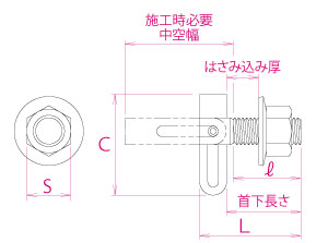 ねじの呼び | 品番 | 全長 L | 首下長さ | ねじ長さ ℓ | はさみ込み厚 | プレート長さ C | 座金付きナット 二面幅S | 施工時必要 中空幅 | 穿孔径 | 入数 | 標準価格 (税抜き) | |