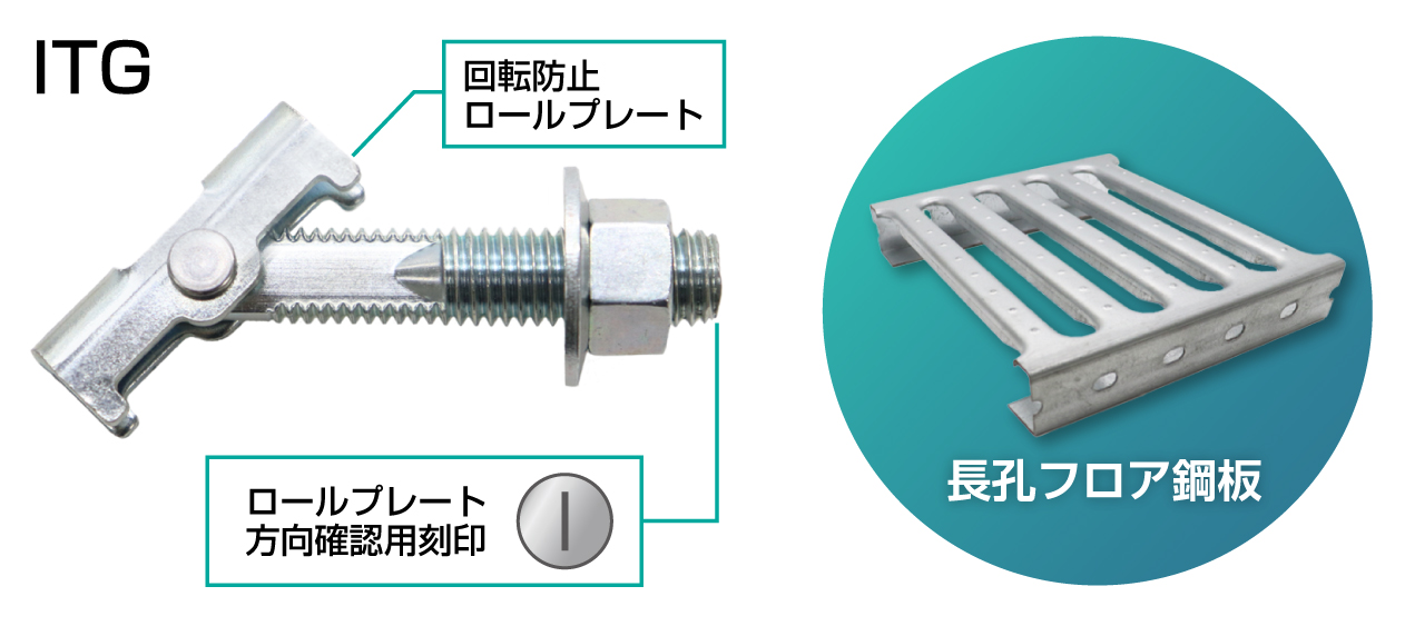 ❷ ロールプレート方向確認用刻印の向きを長孔フロア鋼板の長孔方向と直角となるように合わせる